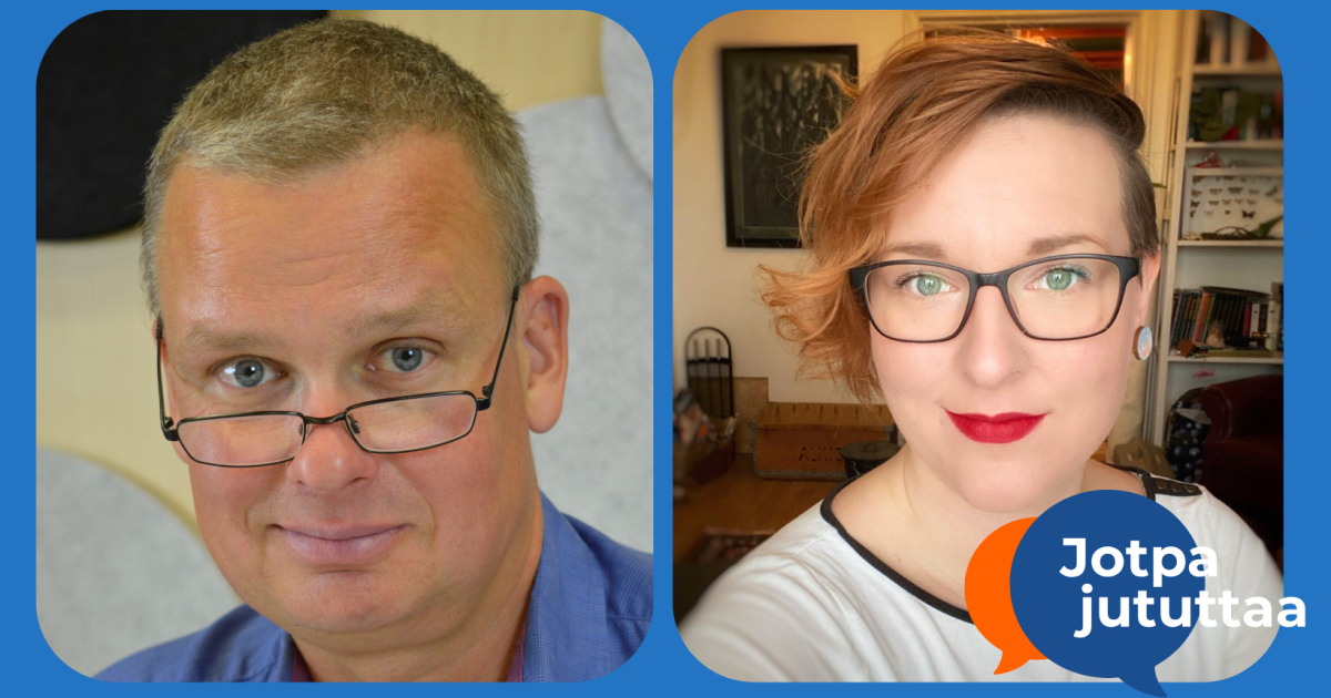 Jotpa jututtaa. Vasemmalla silmälasipäinen mies katsoo kameraan hymyillen. Oikealla silmälasipäinen nainen katsoo kameraan hymyillen.